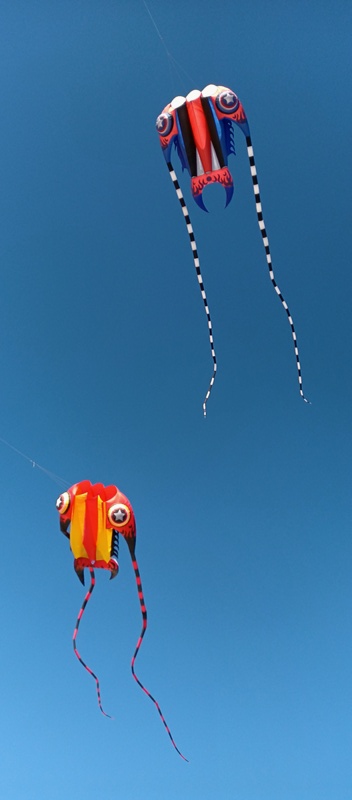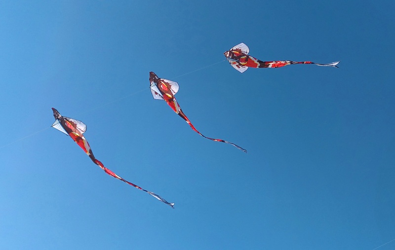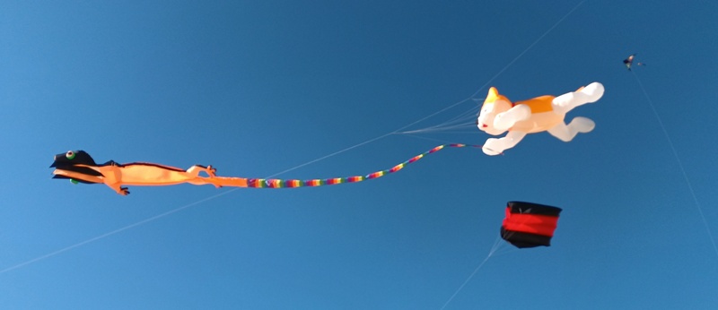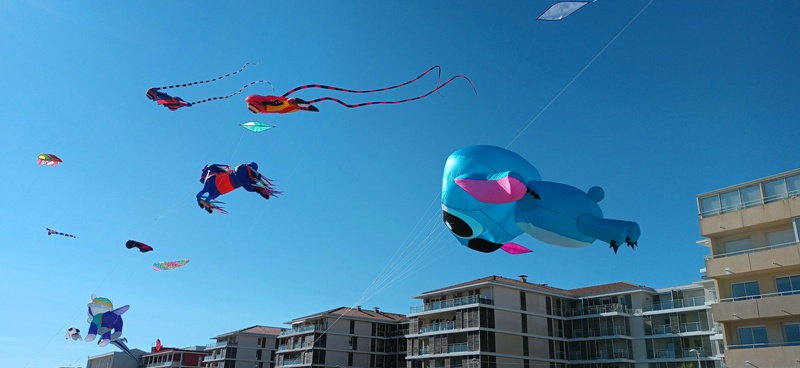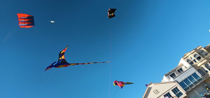 En arrivant à la jonction Palavas-Maguelone de la piste cyclable, je vois flotter eu dessus des bâtiments du front de mer des formes oblongues et mouvantes. Premièrement je me dis, ca y est, les Martiens et les Vénusiens ont débarqué ensemble sur Palavas. Deuxièmement, invité par les mouvements aériens apaisants de ces choses planantes, je décide d’aller voir cela de plus près. Troisièmement, lorsque je peux ajuster mon regard, je déduis que tout cela a l’air bien plus humain qu’extraterrestre ; puis j’estime la taille impressionnante de certains objets volants identifiés relativement aux toits, et qu’il y a de quoi faire de belles photos en cette fin d’après midi.