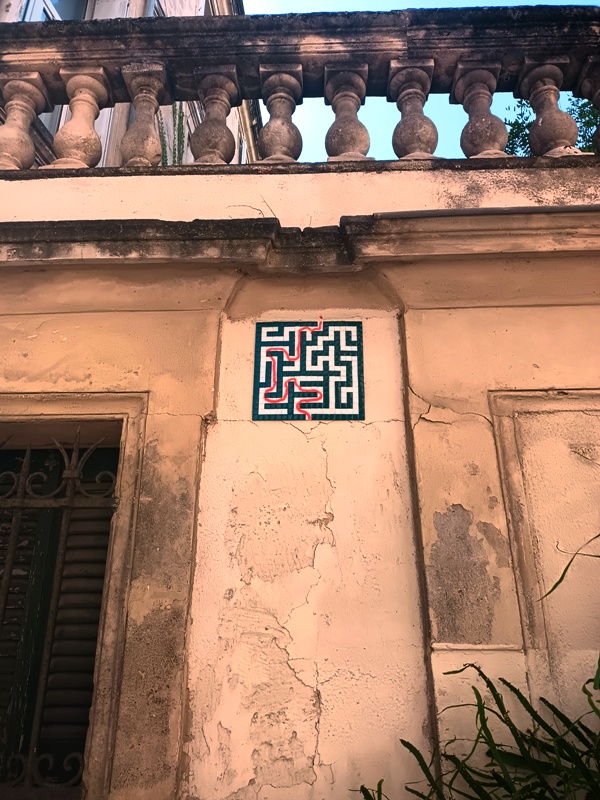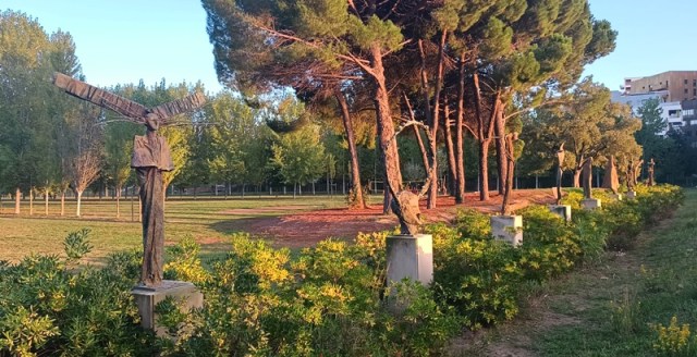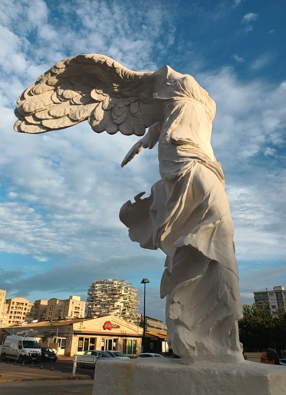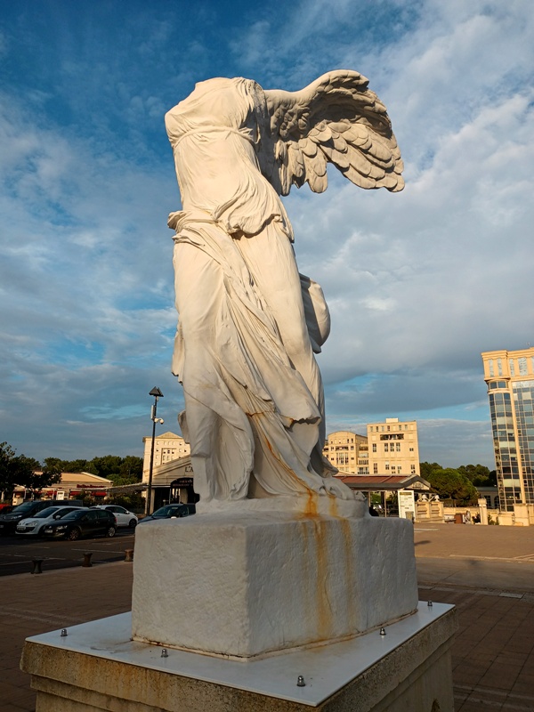- La reproduction de la Victoire de Samothrace un peu souillée de rouille sur la Place de l’Europe ; TOLÉRANCE écrit avec d’étranges personnages sylvestres en bronze, se reflétant sur le miroir d’eau à l’entrée du parc Georges Charpak à Montpellier.