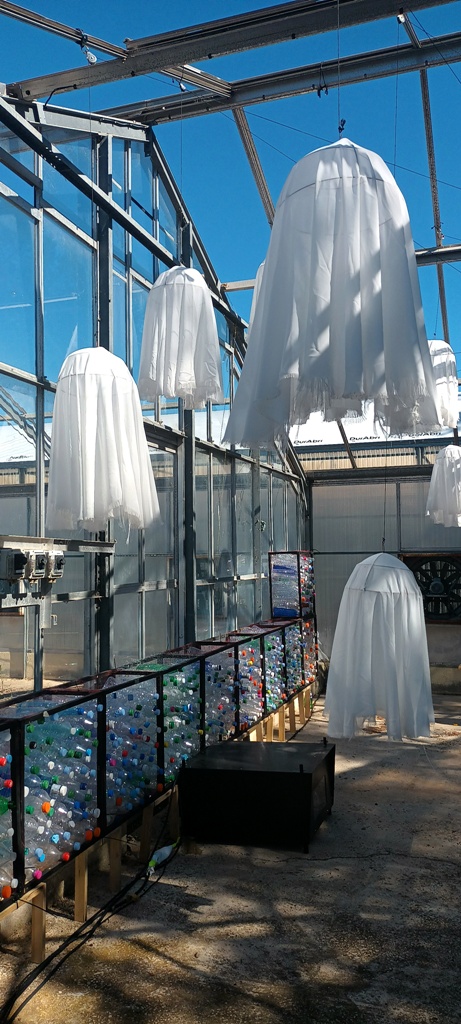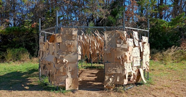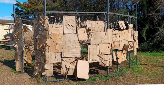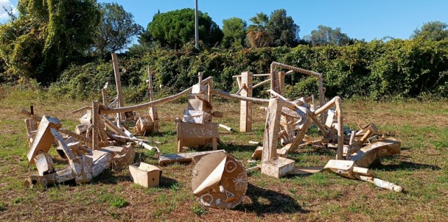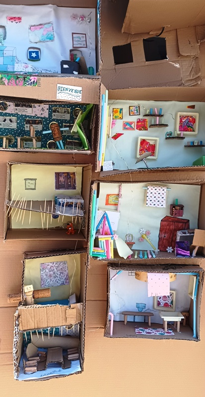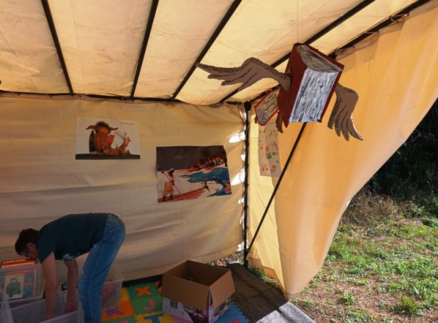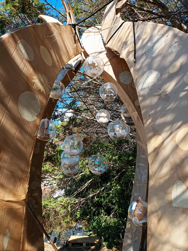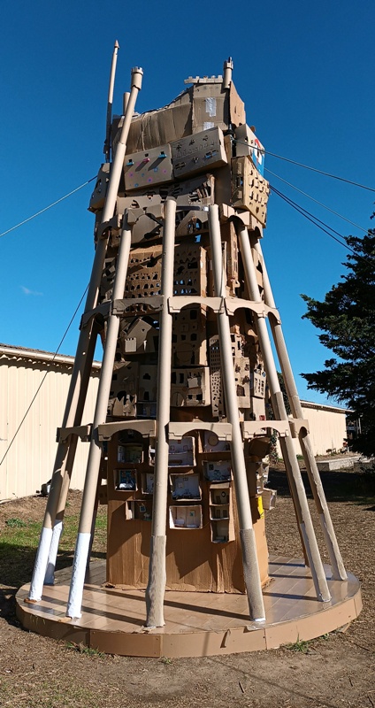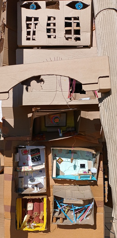 Sur un espace dédié aux scolaires, derrière les serres, se côtoyaient des installations en carton : une tour de Babel monumentale et toute en détails, une ville suspendue qui avait ployé sous la pluie, un temple de la légèreté et une tente-bibliothèque.