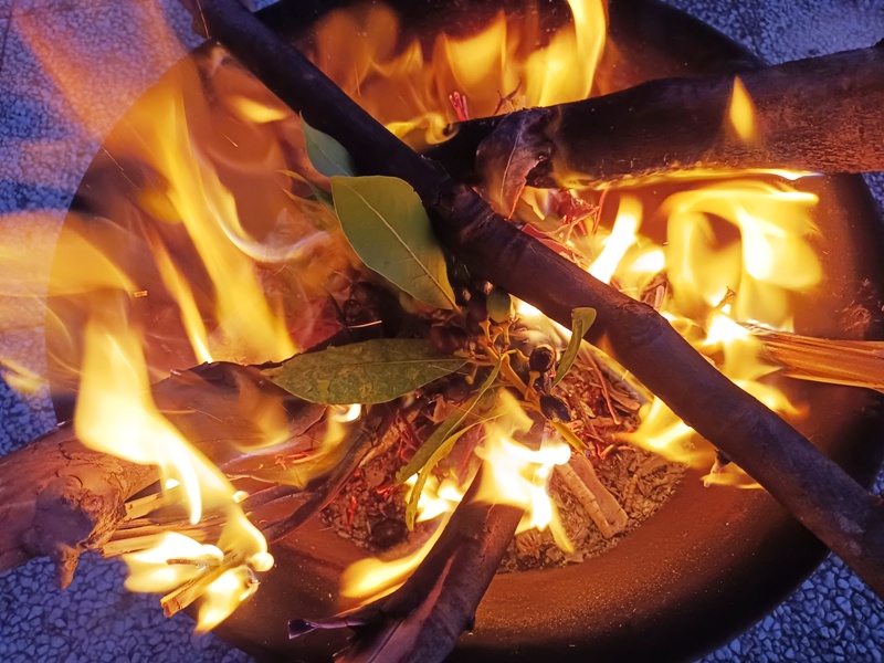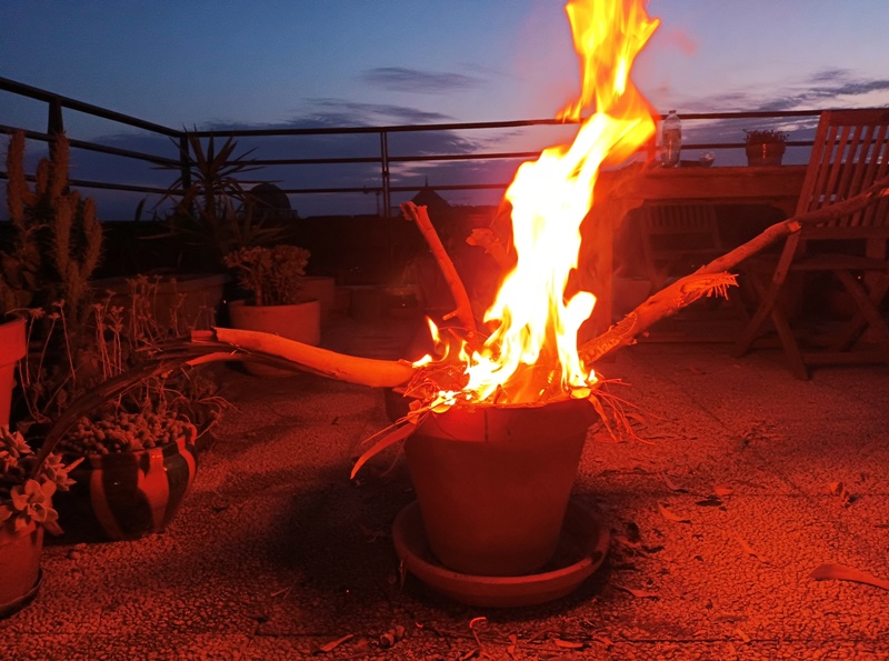 Au matin calme du 14 juillet, quelques branchages secs à débarrasser de la terrasse constituèrent la première matière d’une cérémonie du feu dédié au soleil estival : chaleur et lumière nourricières éclairent les ténèbres, font fuir les miasmes et mauvaises énergies. Ce feu rituel a duré jusqu’au soir sous forme de braises chaudes, alimenté par du bois, des pommes de pin, des figues vertes, des aiguilles de pin sèches et quelques feuilles d’eucalyptus, le tout récoltés dans le parc environnant. Tout me disait que c’était le moment propice pour commémorer et honorer ce grand espoir qui s’est levé en France en 1789 parmi le peuple. Un espoir qui a fini par mettre à bas un Ancien Régime décrépi et moisi, un espoir qui a motivé par la suite d’autres peuples du monde à s’émanciper de leurs chaînes.