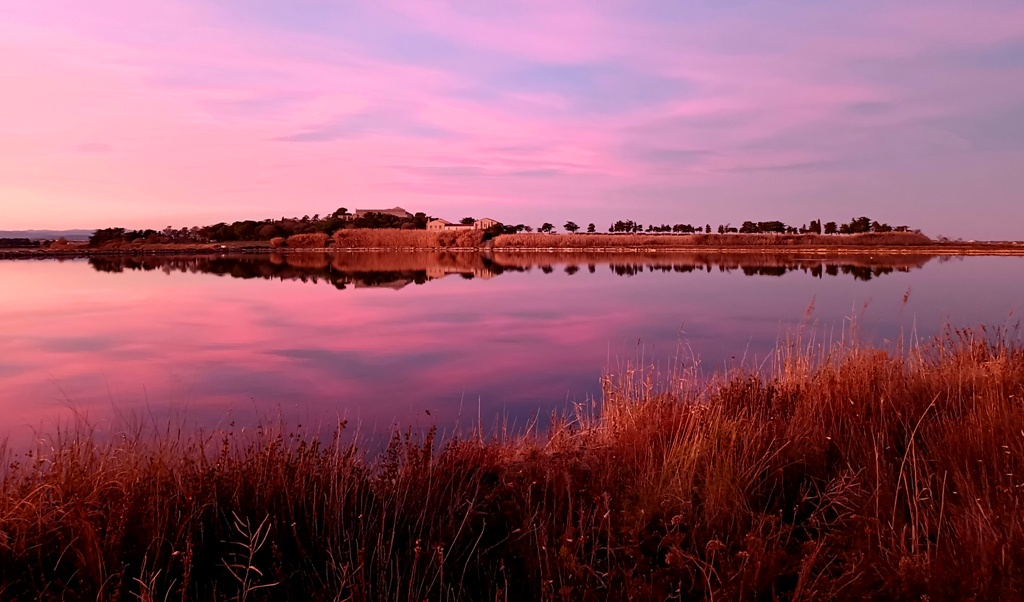 La cathédrale de Maguelone, imposante d’élégance et de sobriété romane, surplombe l’étang de l’Arnel depuis plus d’un millénaire. Du fait de sa situation géographique tout au bout de la commune de Villeneuve-lès-Maguelone, en lévitation entre ciel et son miroir d’eau, elle est restée à l’écart du flot touristique estival. Mais maintenant que Le Comptoir des Compagnons, un restaurant gastronomique, a été inauguré dans une des annexes par l’association Les compagnons de Maguelone (ESAT, Établissement de Service et D’aide par le Travail) et qu’a été ouvert un deuxième accès au site, sur le chemin du petit train qui fait le trajet pour aller à la plage en le contournant, depuis la passerelle qui traverse le canal du Rhône à Sète, la petite île draine davantage de visiteurs.